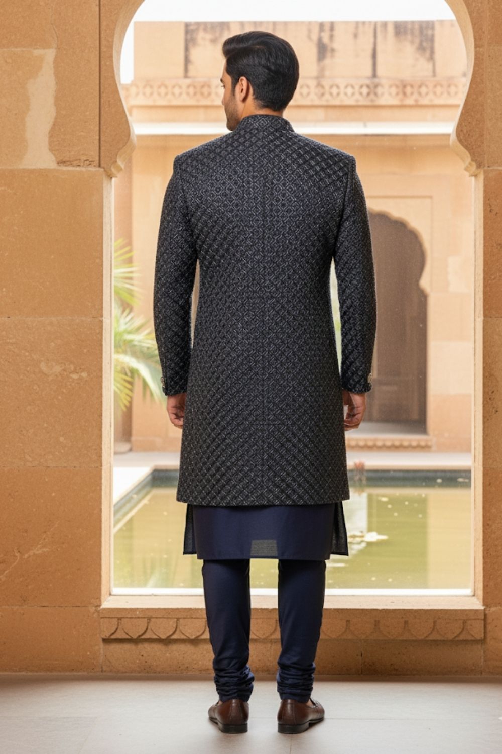 Rent this exquisite navy blue embroidered sherwani, featuring intricate detailing and a mandarin collar, perfect for weddings and festive occasions.