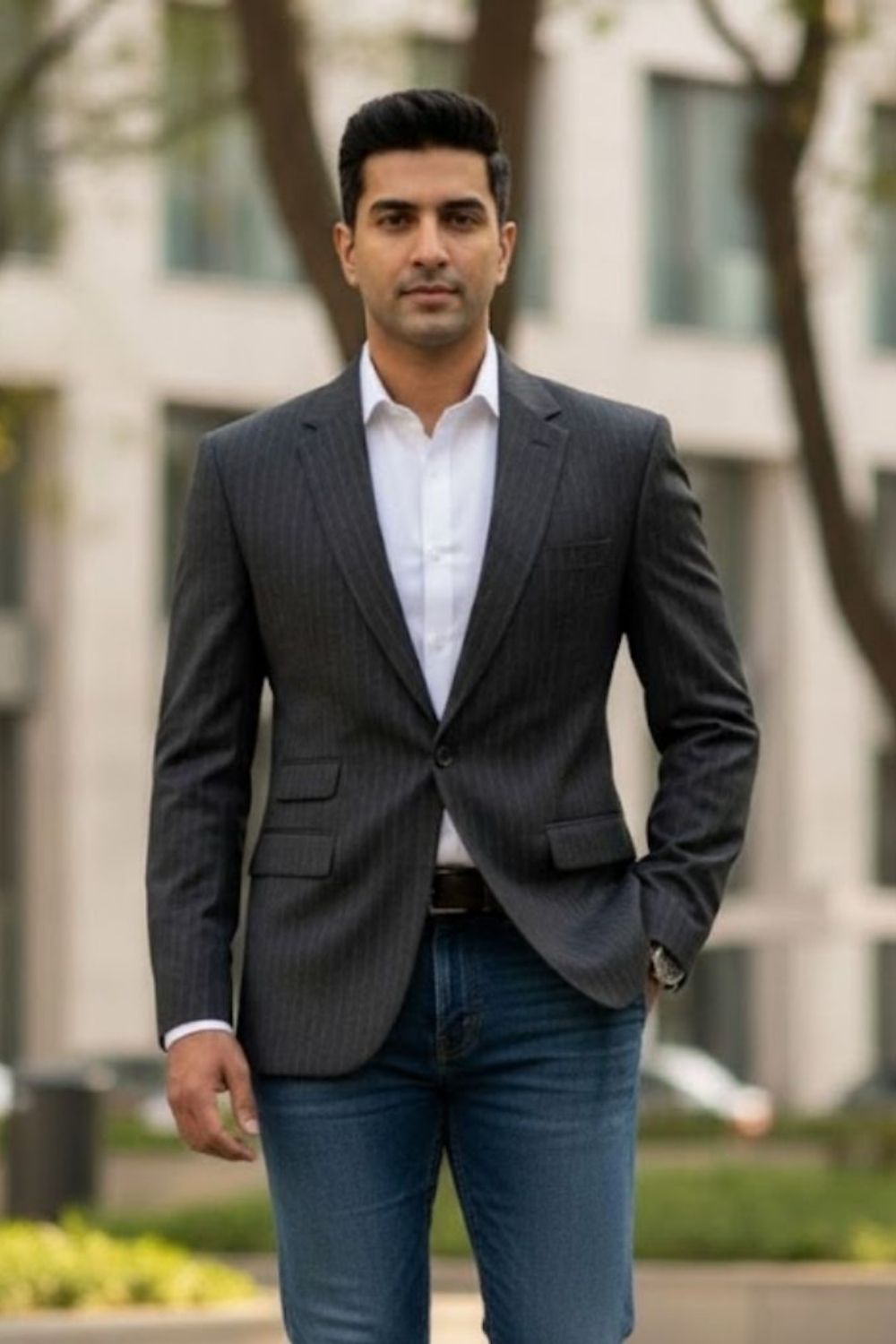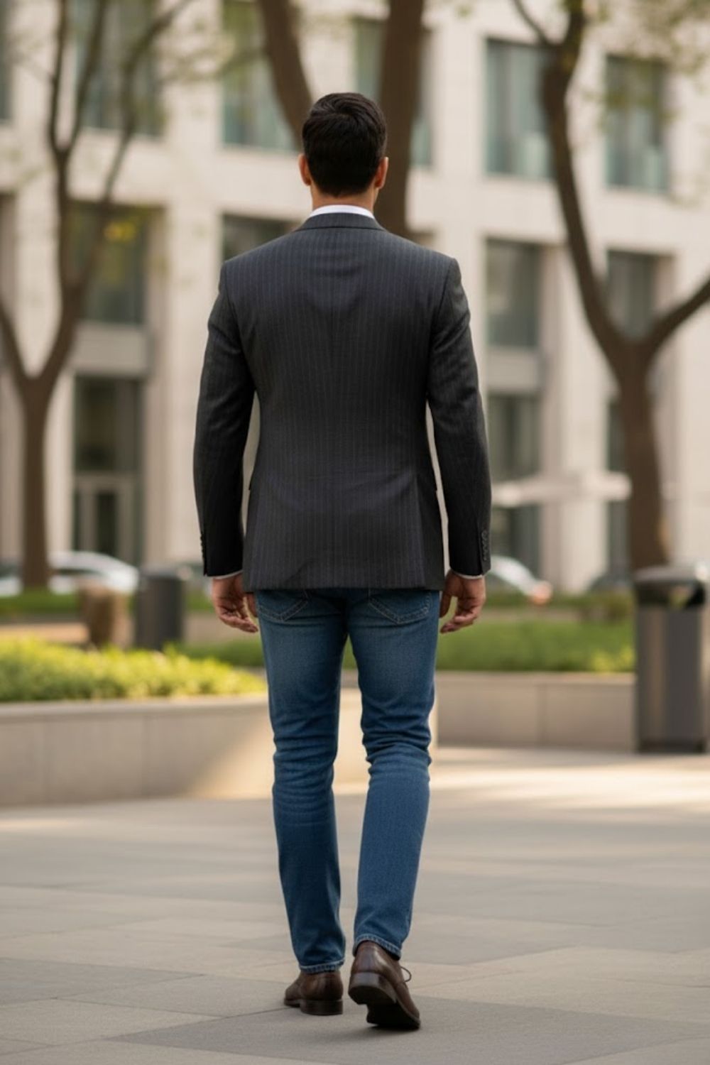 Rent this classic black single-button blazer, featuring a subtle vertical white pinstripe work.
