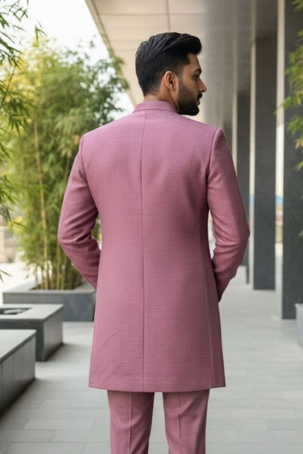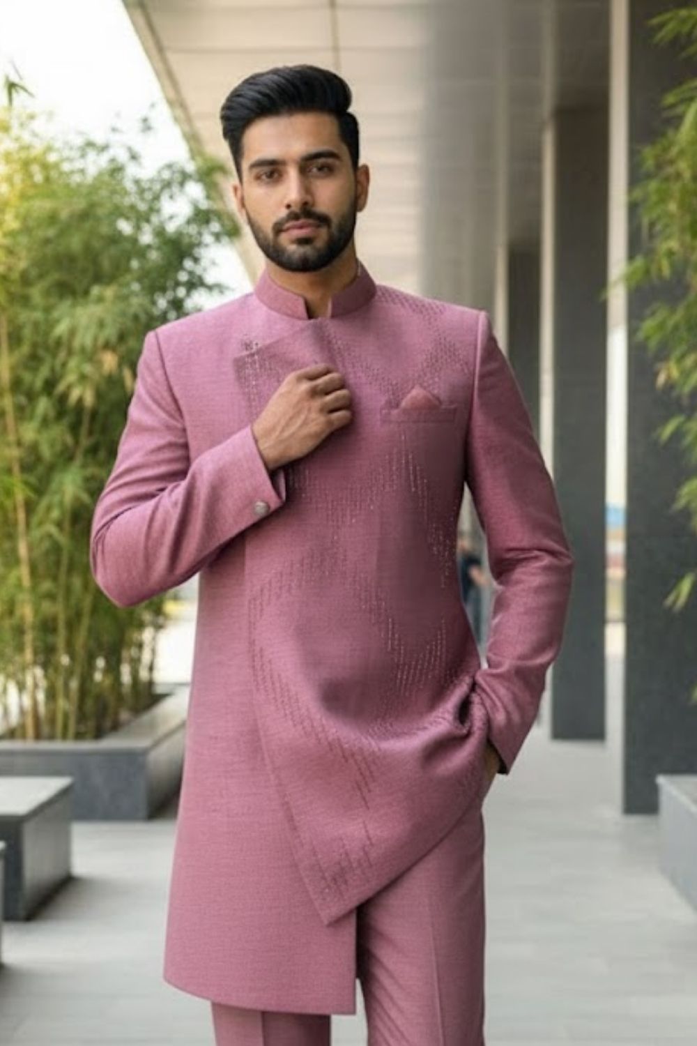 Rent this stylish pink indo-western in a textured fabric, featuring minimalist silver bead detailing in a modern vertical line pattern.