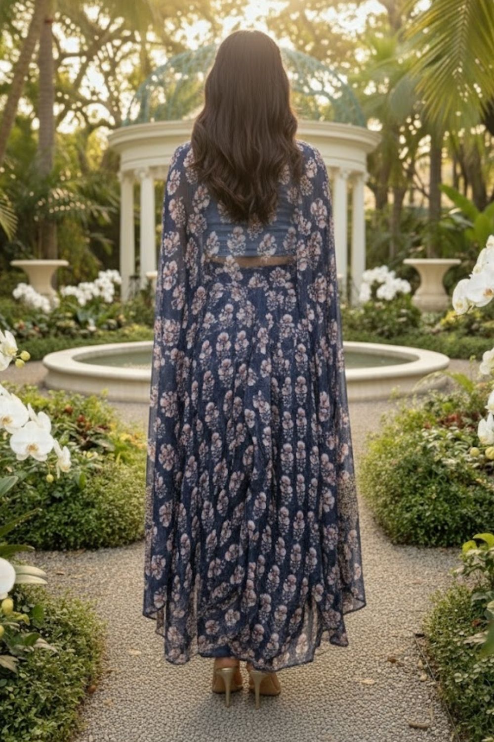 Rent this chic blue crop top and navy printed draped skirt set in silk and georgette fabric, paired with a long sheer floral printed cape featuring delicate Zari border work.