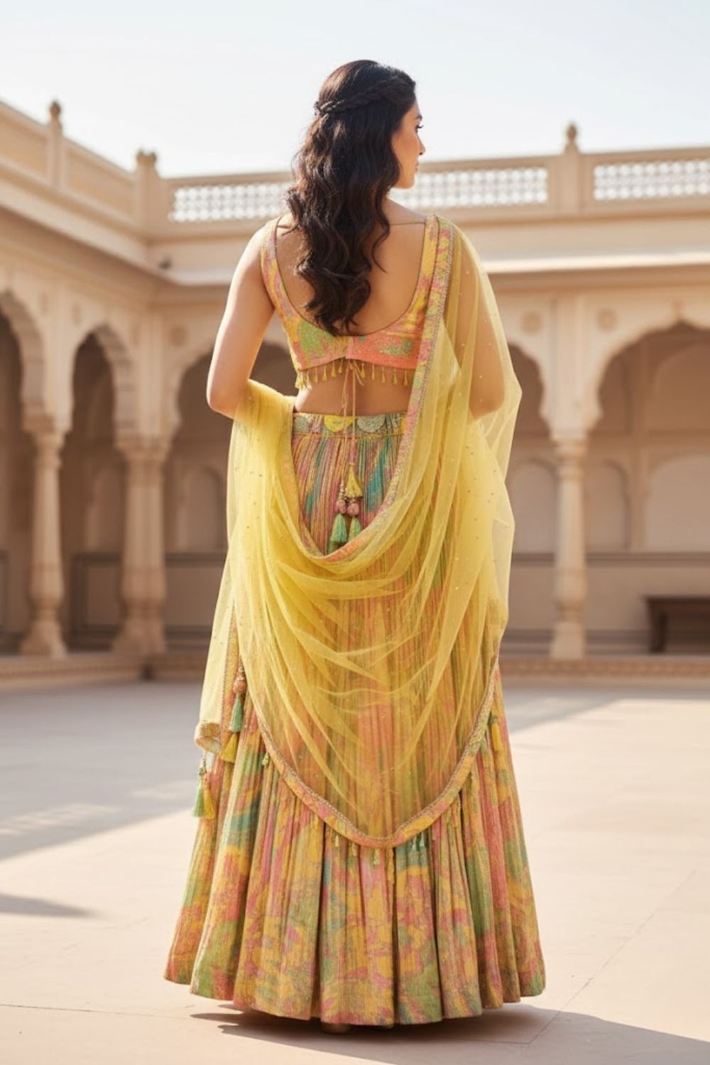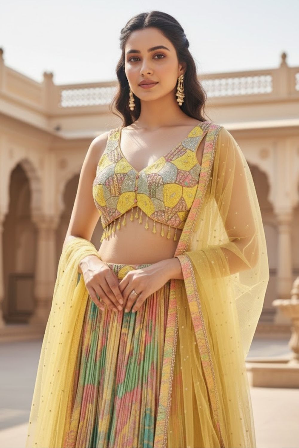 Rent this playful multi-color printed featuring a pleated fabric with an abstract floral print on skirt, paired with a heavily beaded and sequined blouse and a net dupatta.