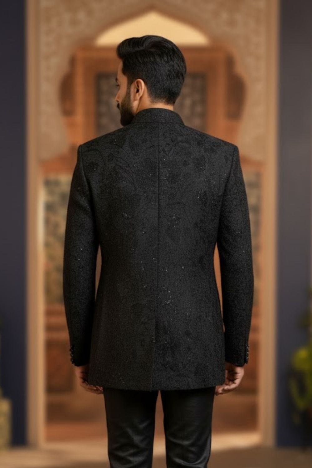 Rent this black bandhgala suit crafted from luxurious net fabric, featuring all-over intricate tone-on-tone sequin and thread embroidery work.