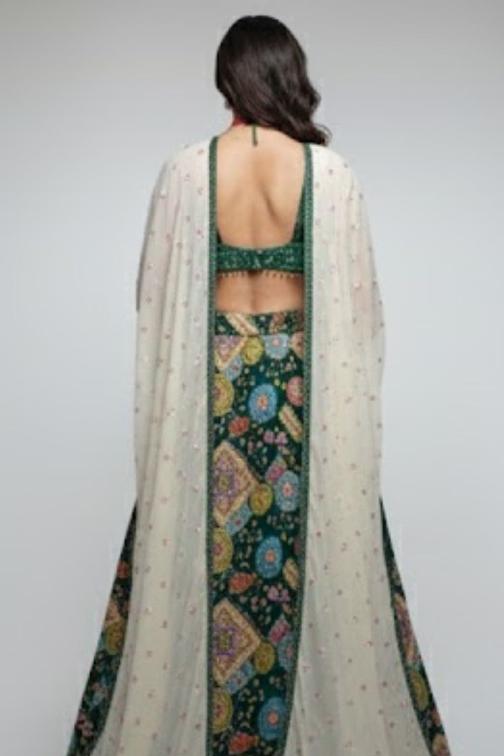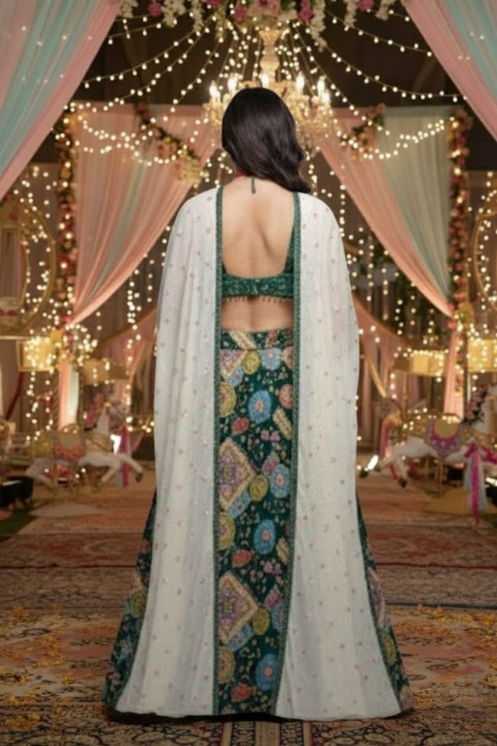 Rent this unique green lehenga set in a full-flare silhouette, featuring intricate multi-color geometric floral thread and sequin embroidery.