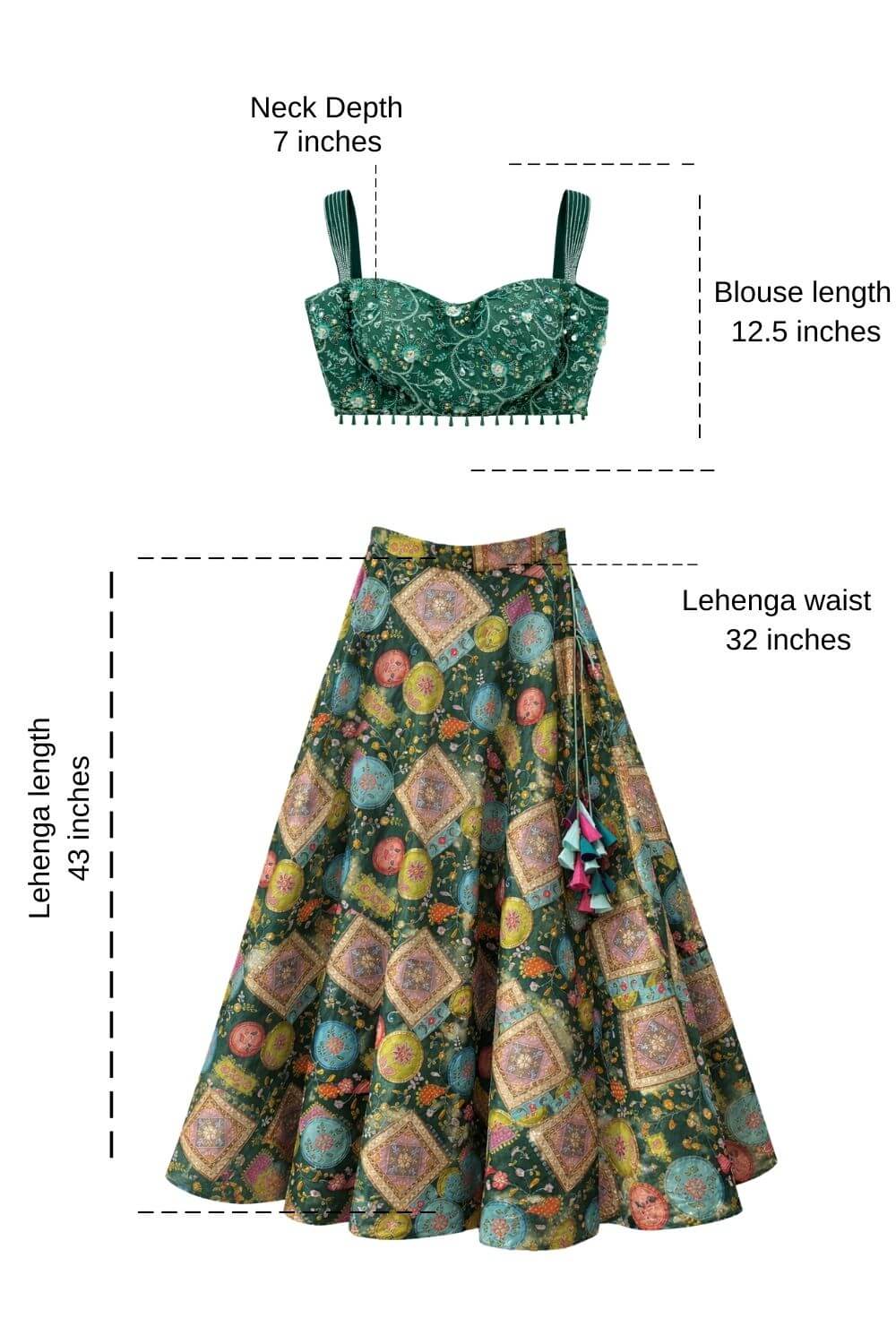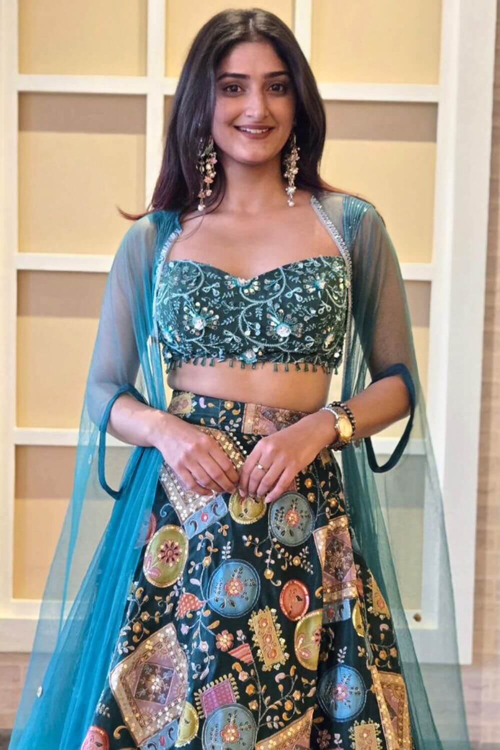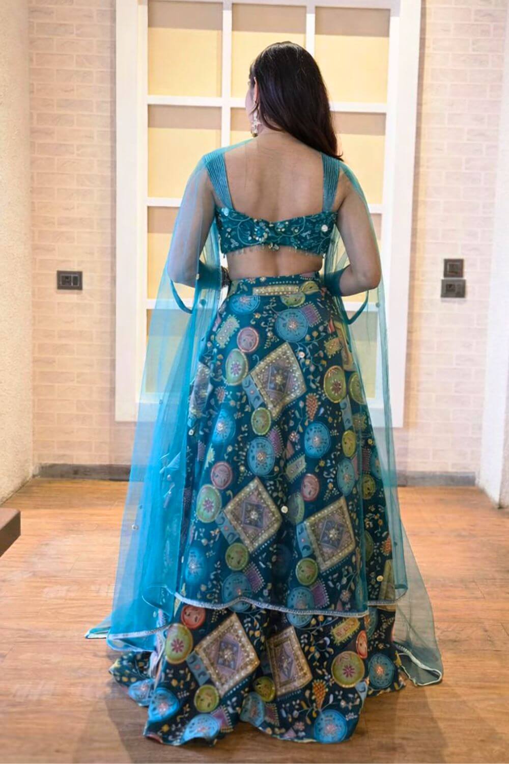 Rent this vibrant teal lehenga featuring playful multicolored prints, blouse with back opening, and a sheer net cape, perfect for carnival and mehendi functions.
