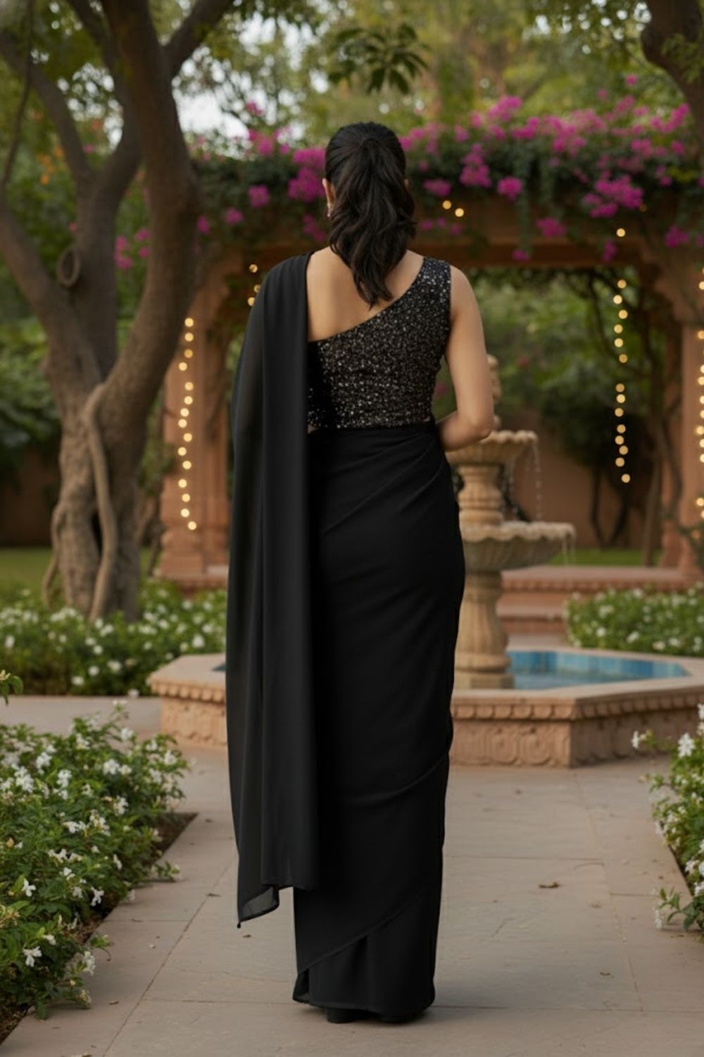 Rent this timeless classic black pre-draped saree, crafted from luxurious georgette fabric, paired with one-shoulder blouse featuring all-over sequin shimmer work.