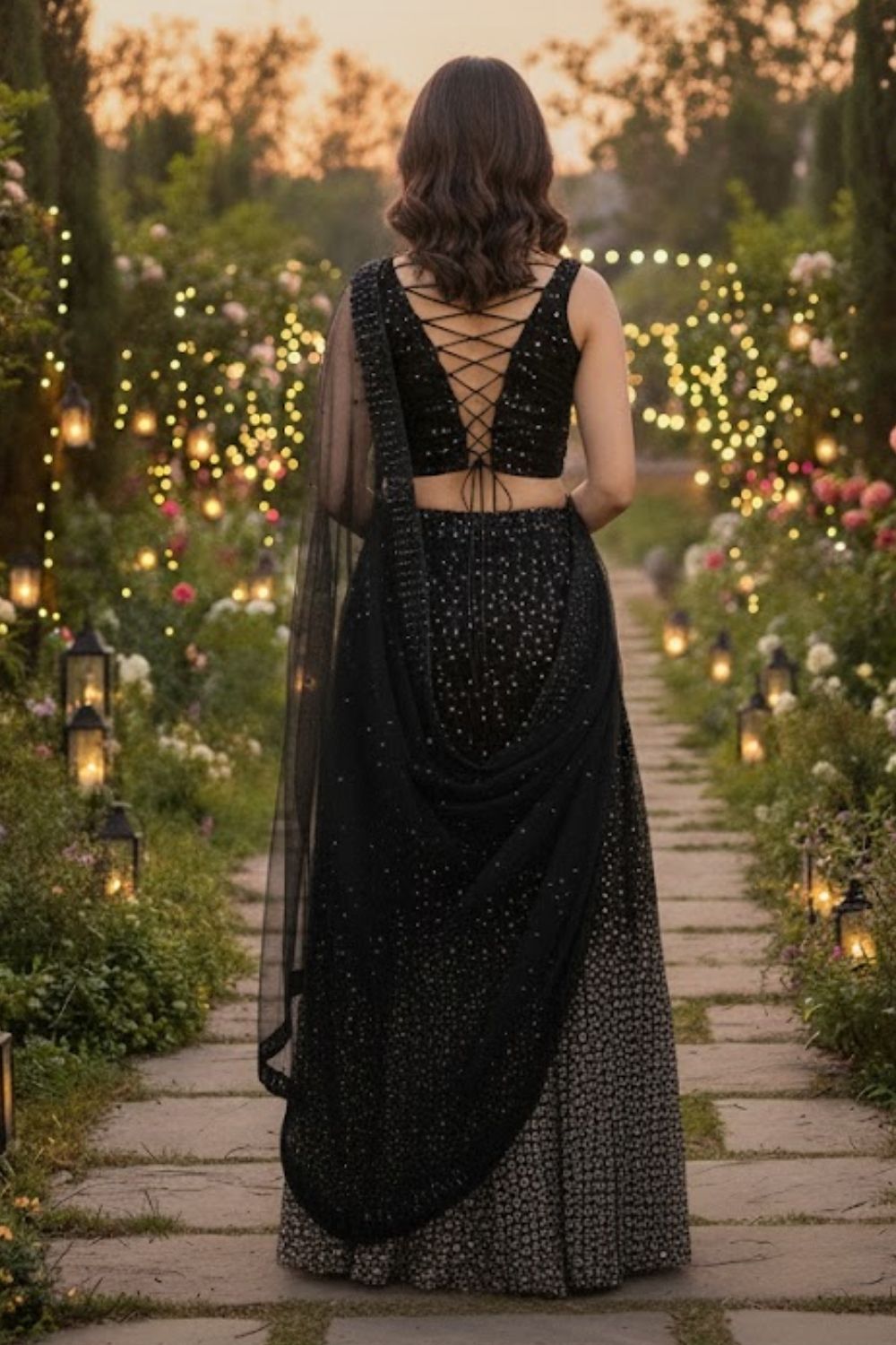 Rent this dark and dramatic black lehenga choli crafted from sheer net material, showcasing intricate black and copper sequin work in a dazzling pattern.
