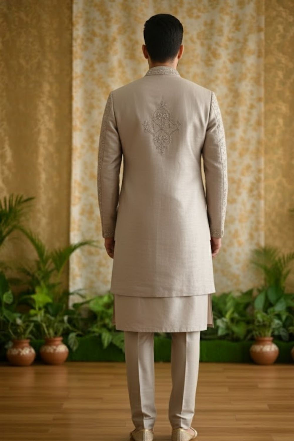 Rent this stunning layered grey raw silk Indo-Western Set with intricate mirror and thread embroidery.
