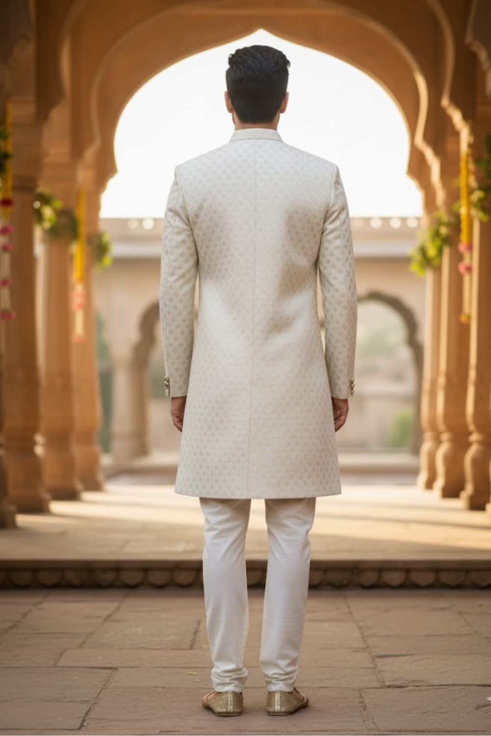 Rent this stunning light greenish grey sherwani, featuring geometrical pattern print all over the body.