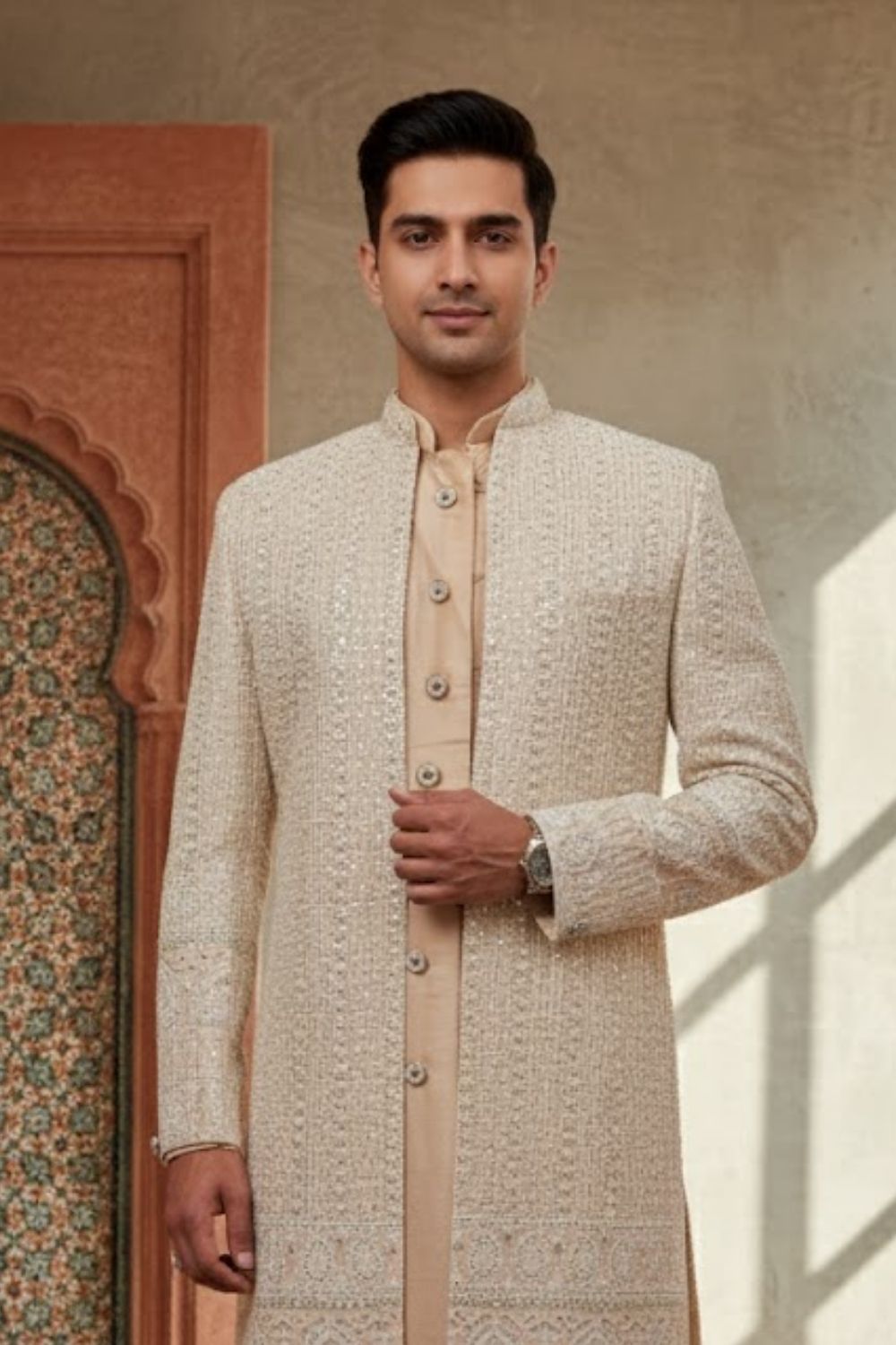 Rent this elegant peach designer Sherwani with jacket, featuring intricate all-over thread and sequin embroidery for a sophisticated look.
