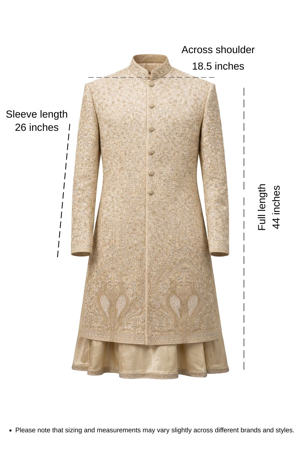 Rent this grand champagne designer sherwani, featuring dense all-over heavy rich embroidery with a matching bordered stole and bottoms.