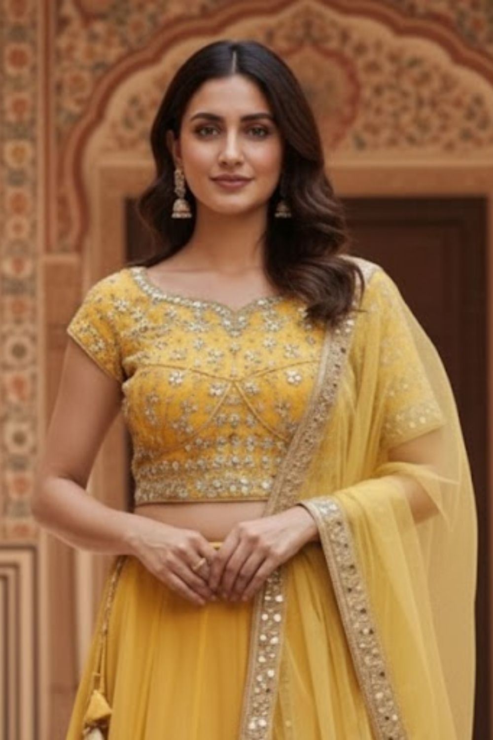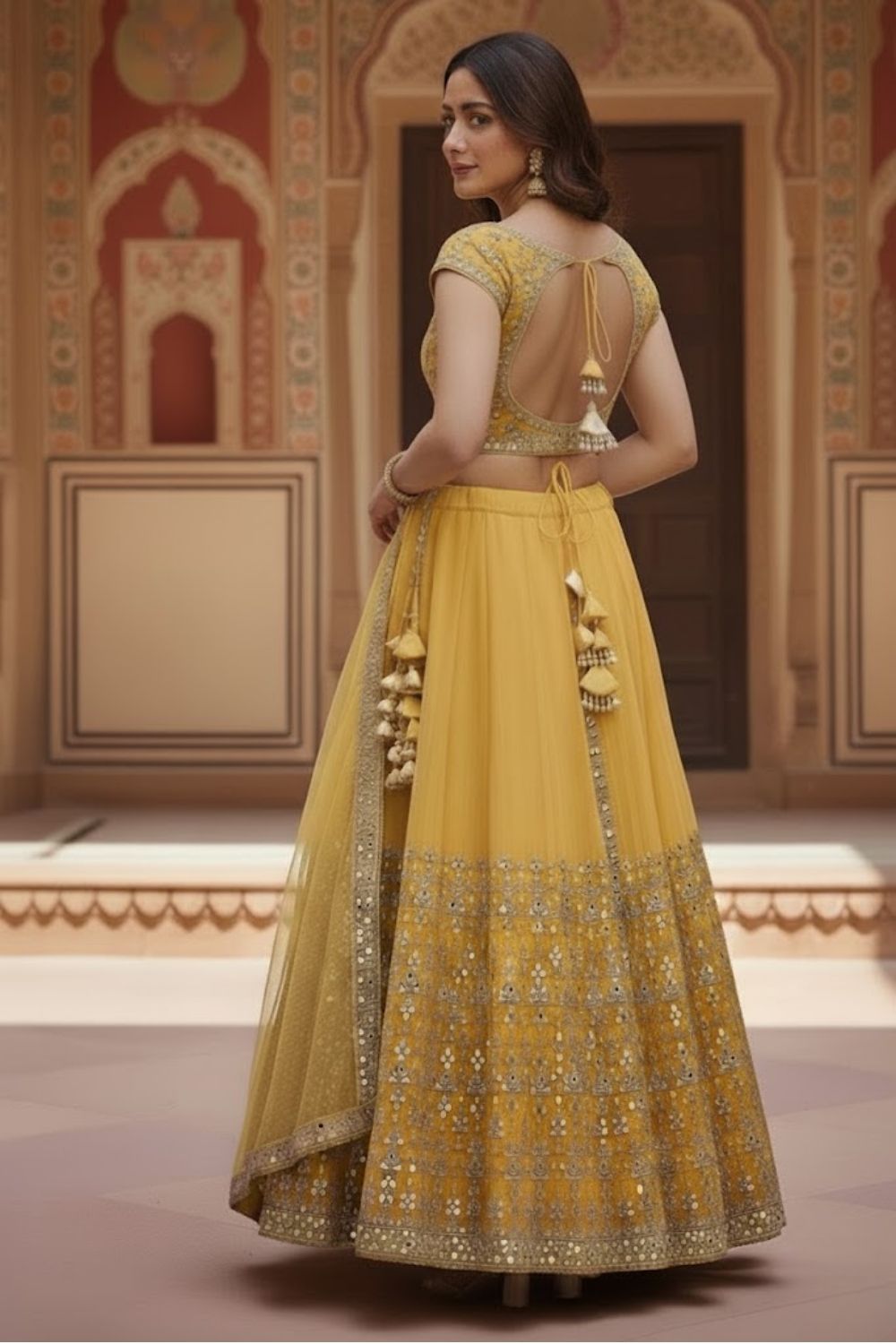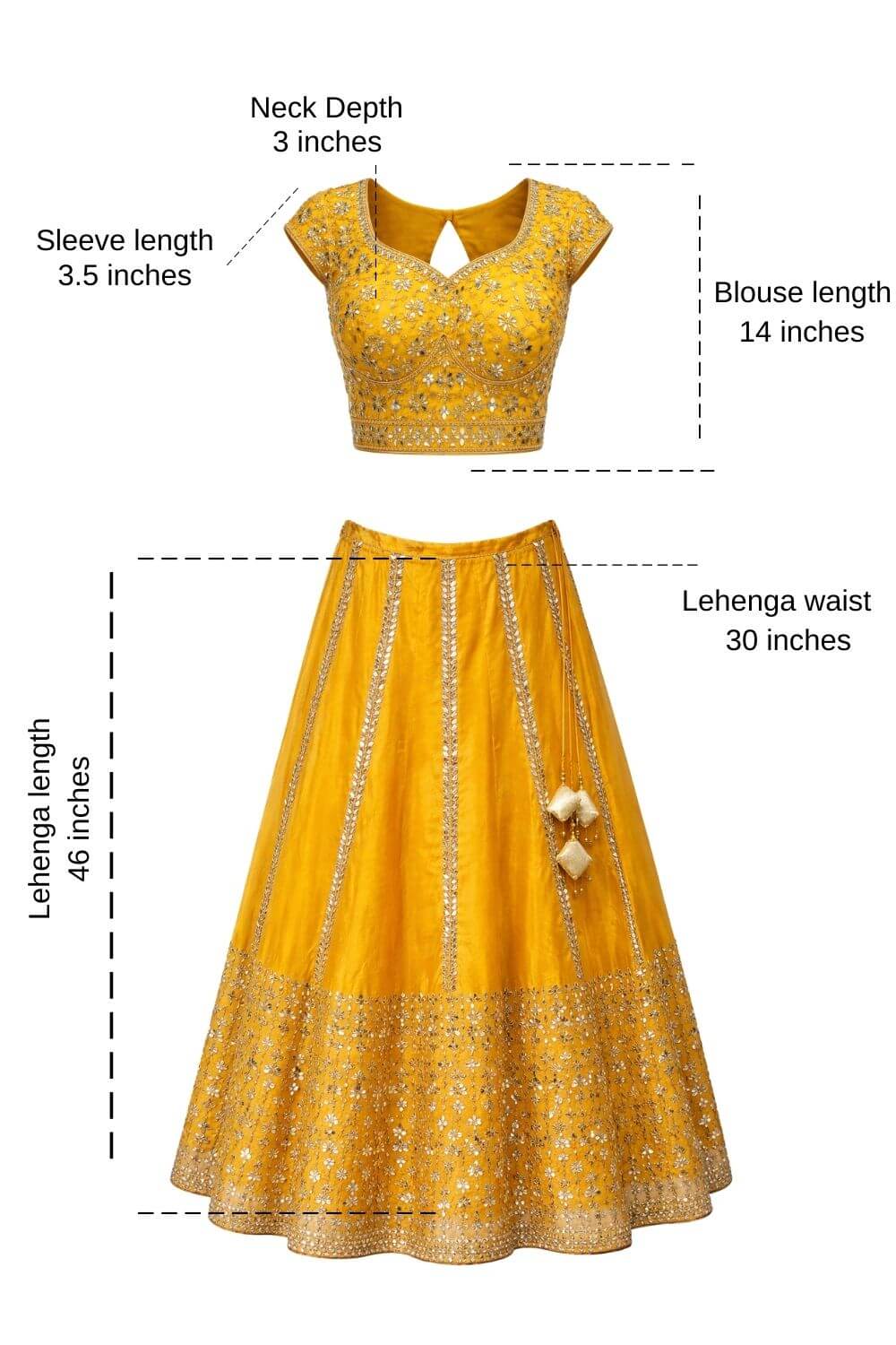 Rent this lightweight mustard yellow net lehenga with intricate mirror work, blouse featuring side zip, adjustable drawstring waist, perfect for haldi ceremonies and festive celebrations.