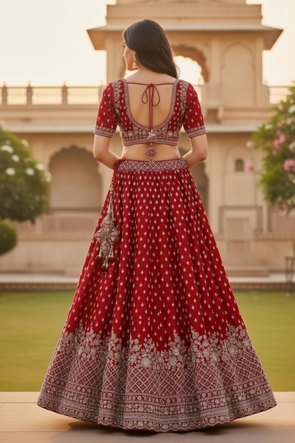 Rent this gorgeous red bridal lehenga set, showcasing extensive detailed handwork and crystal embellishments styled with a blouse and a single dupatta.