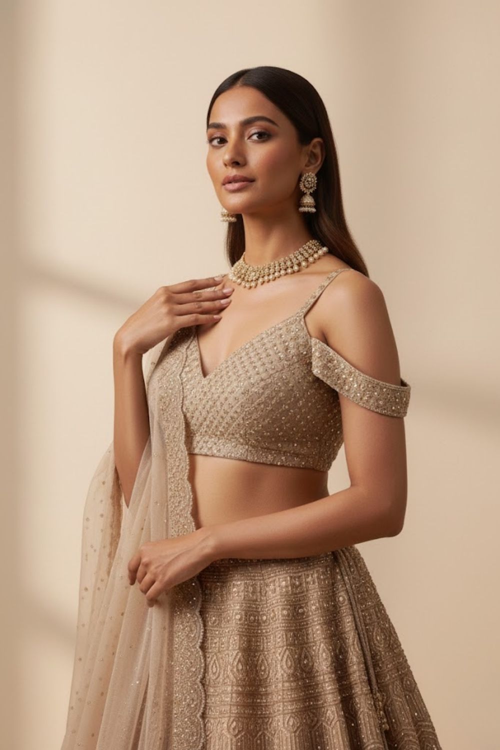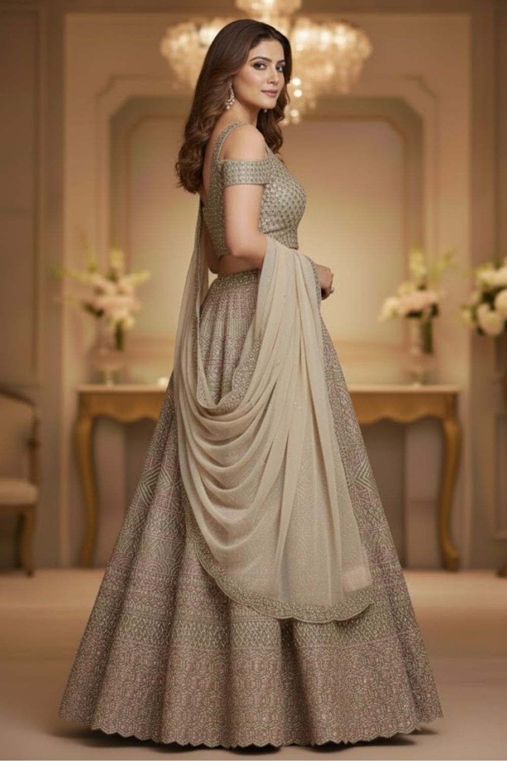 Rent this exquisite Champagne Beige Georgette Lehenga featuring delicate all-over gold thread and sequin embroidery, paired with an embroidered cold-shoulder blouse and matching net dupatta.