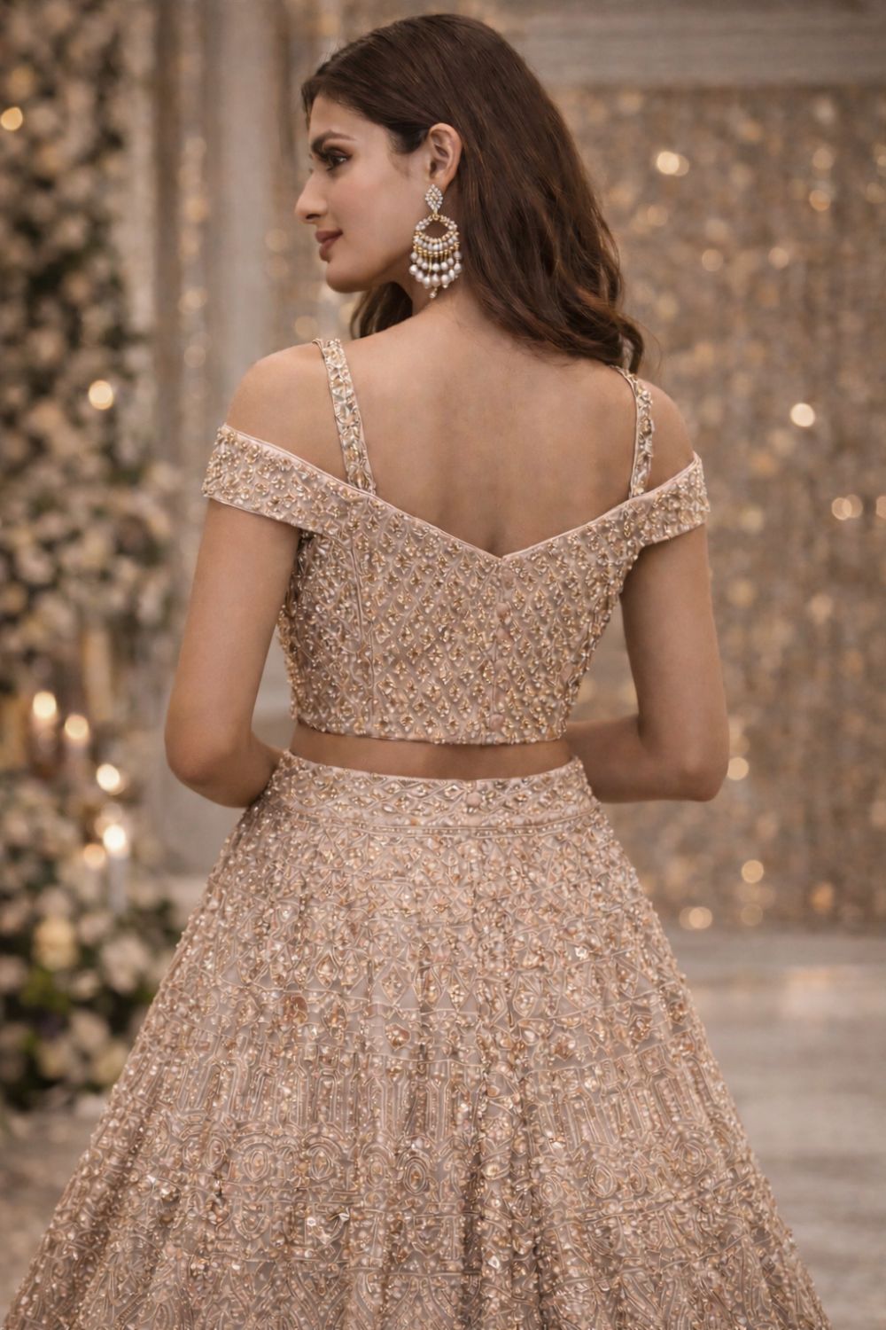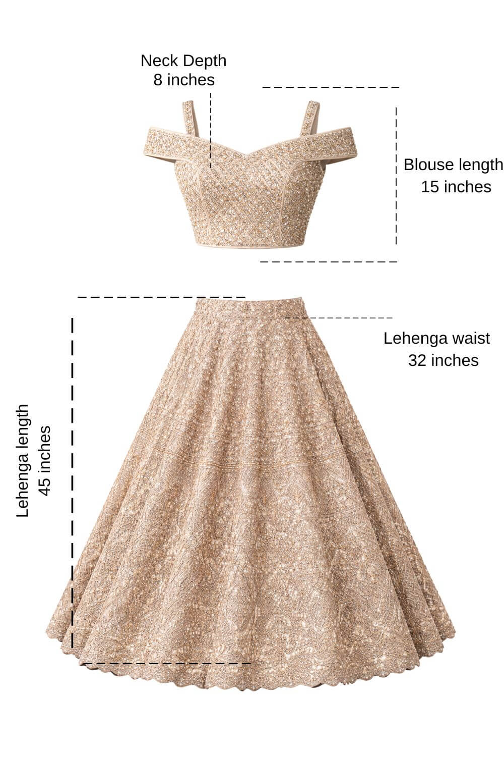 Rent this exquisite Champagne Beige Georgette Lehenga featuring delicate all-over gold thread and sequin embroidery, paired with an embroidered cold-shoulder blouse and matching net dupatta.