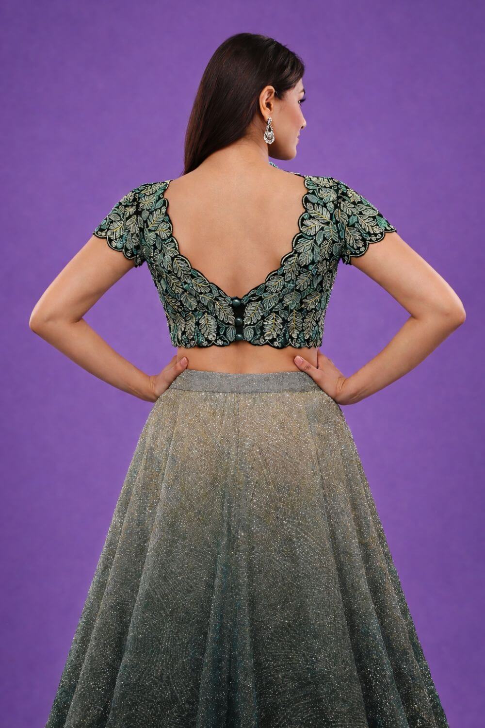 Rent this gold embroidered lycra sequin lehenga with gold-to-green ombre. Cut dana V-neck blouse with back opening and embroidered choker dupatta. Perfect for receptions, sangeet, cocktail events.