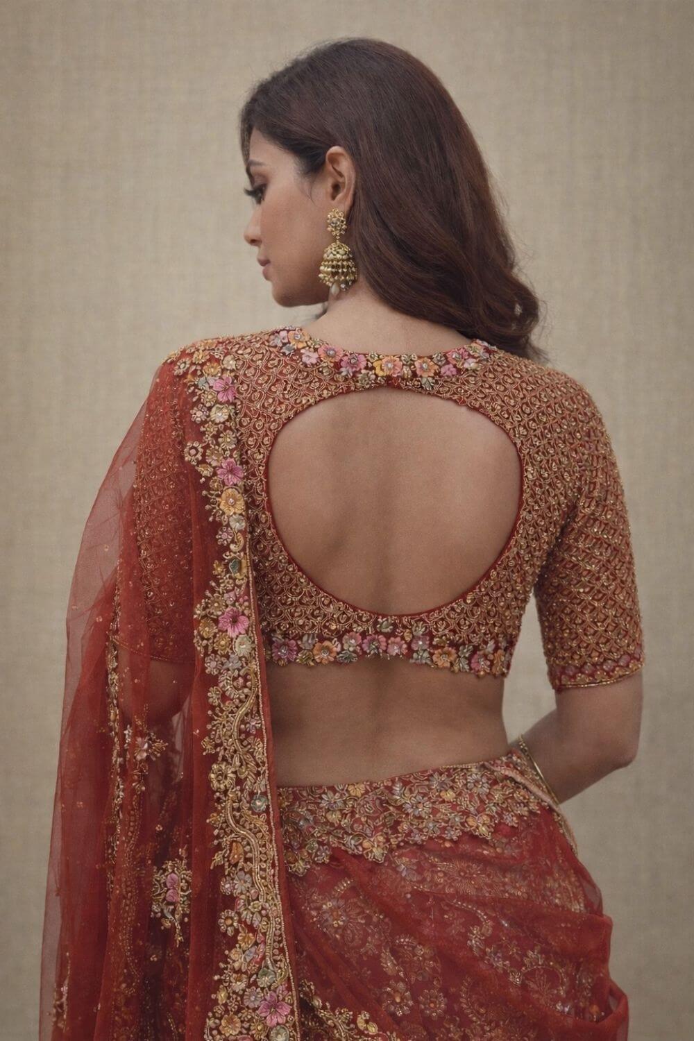 Rent this artistic red silk bridal lehenga with multicolor resham and zardozi embroidery. Includes blouse with back opening, adjustable waist, belt, and double dupattas.
