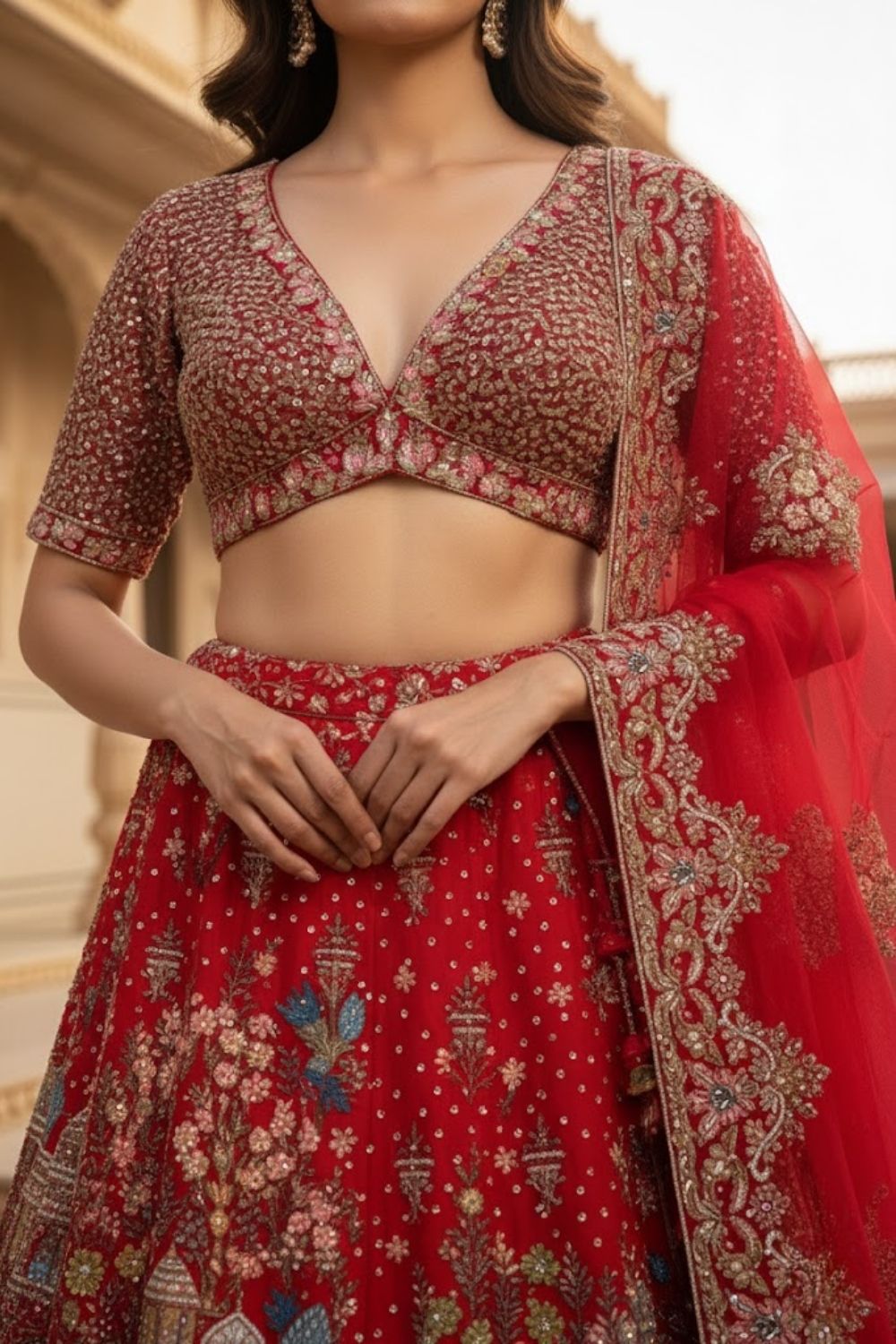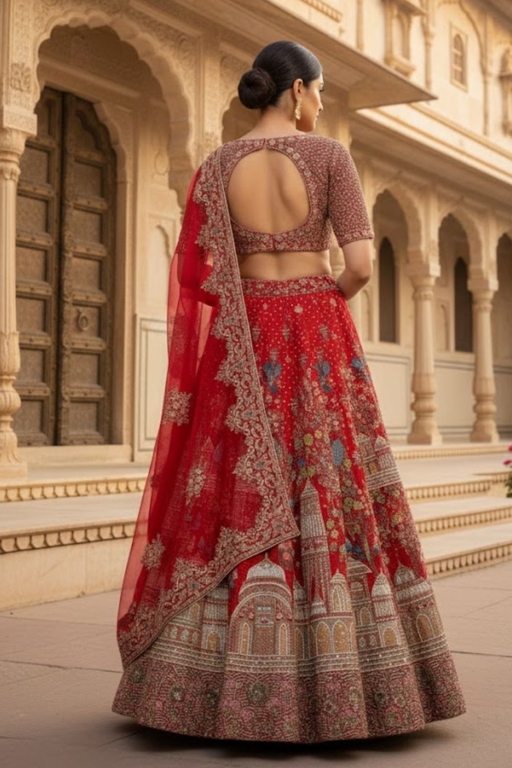 Rent this artistic red silk bridal lehenga featuring intricate multi-color resham and zardozi embroidery depicting detailed architectural and miniature landscape motifs, paired with a blouse, belt and double dupatta.