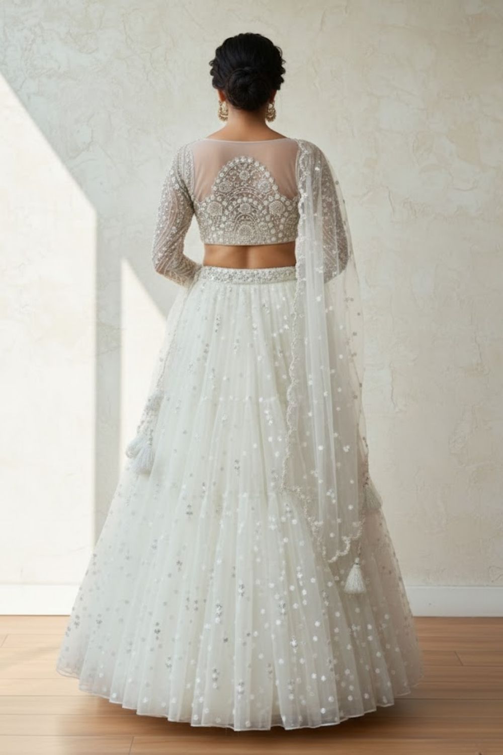 Rent this ethereal pearl white net lehenga set, detailing done with sequin, silver zardozi, beads and pearls on blouse, with a small flowers and white beads on lehenga and dupatta.