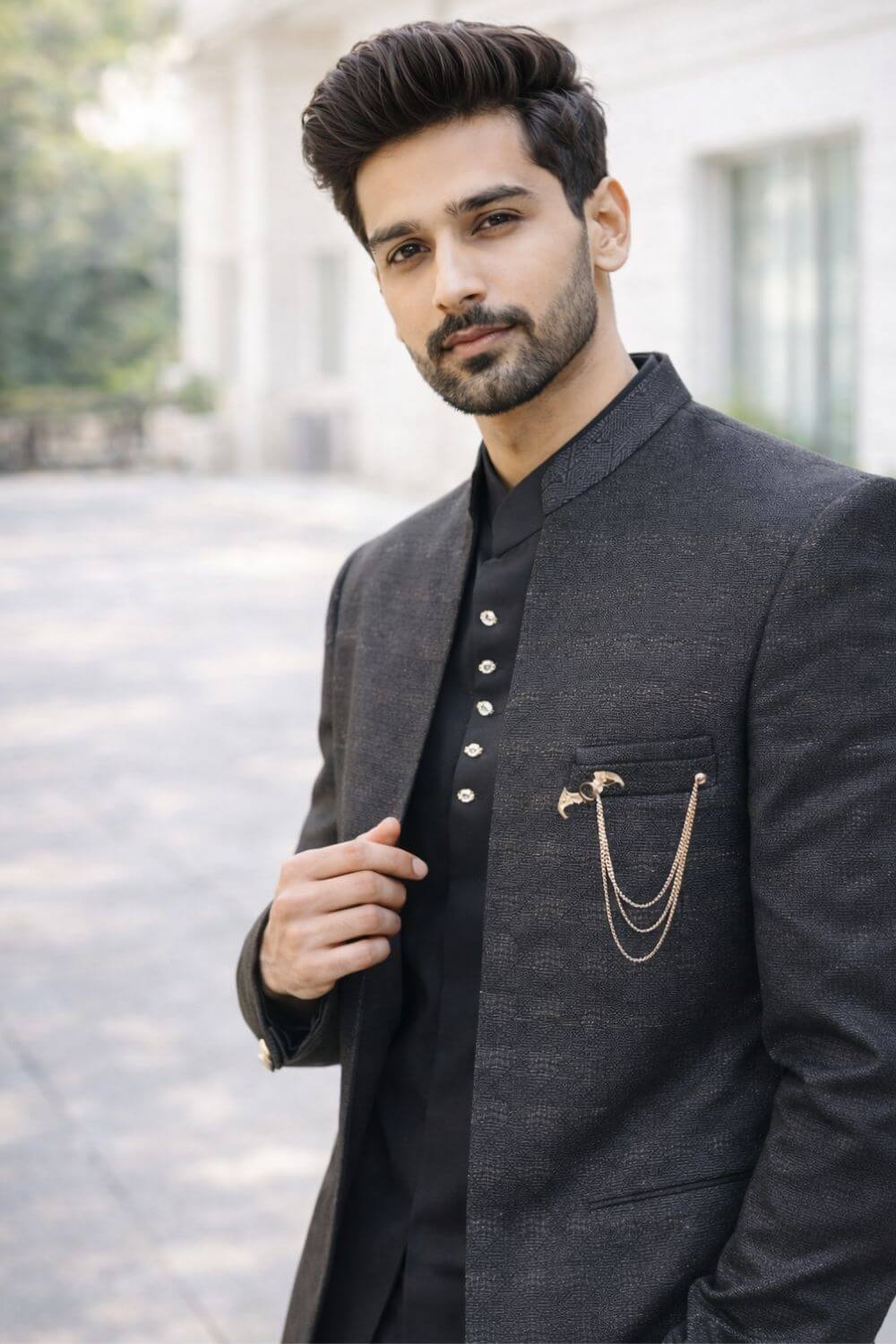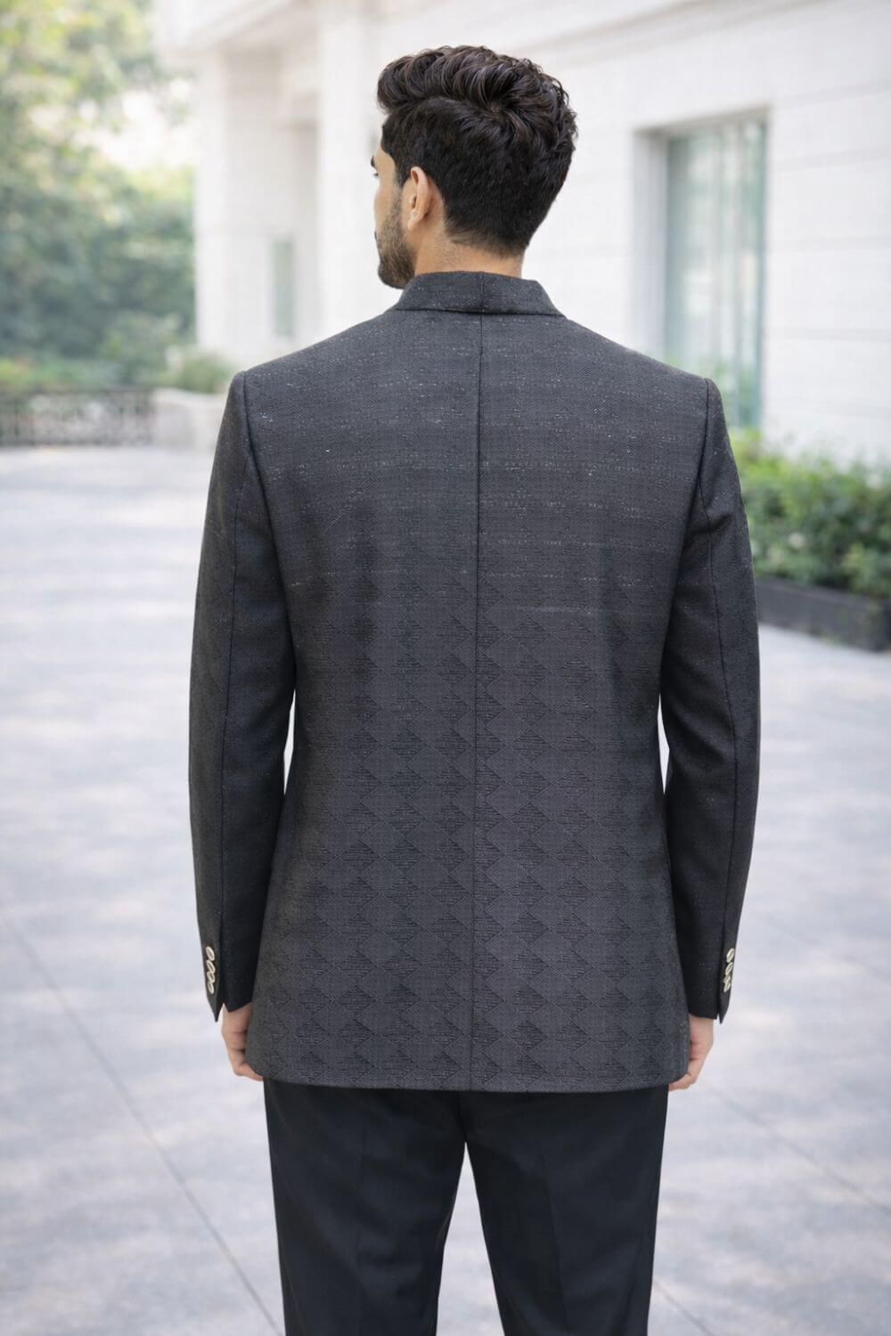 Sherwani set in classic black crafted in jacquard silk featuring subtle textured embroidery. Perfect for weddings and receptions. Includes sherwani, kurta and trousers. Shoulder: 18”, Chest: 42”.