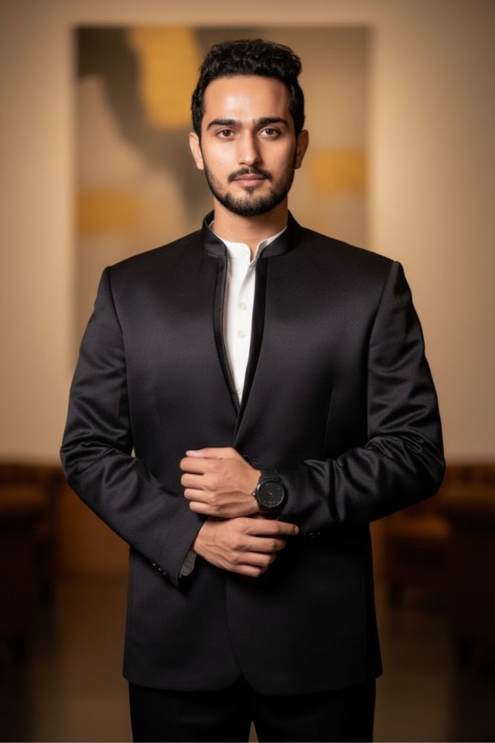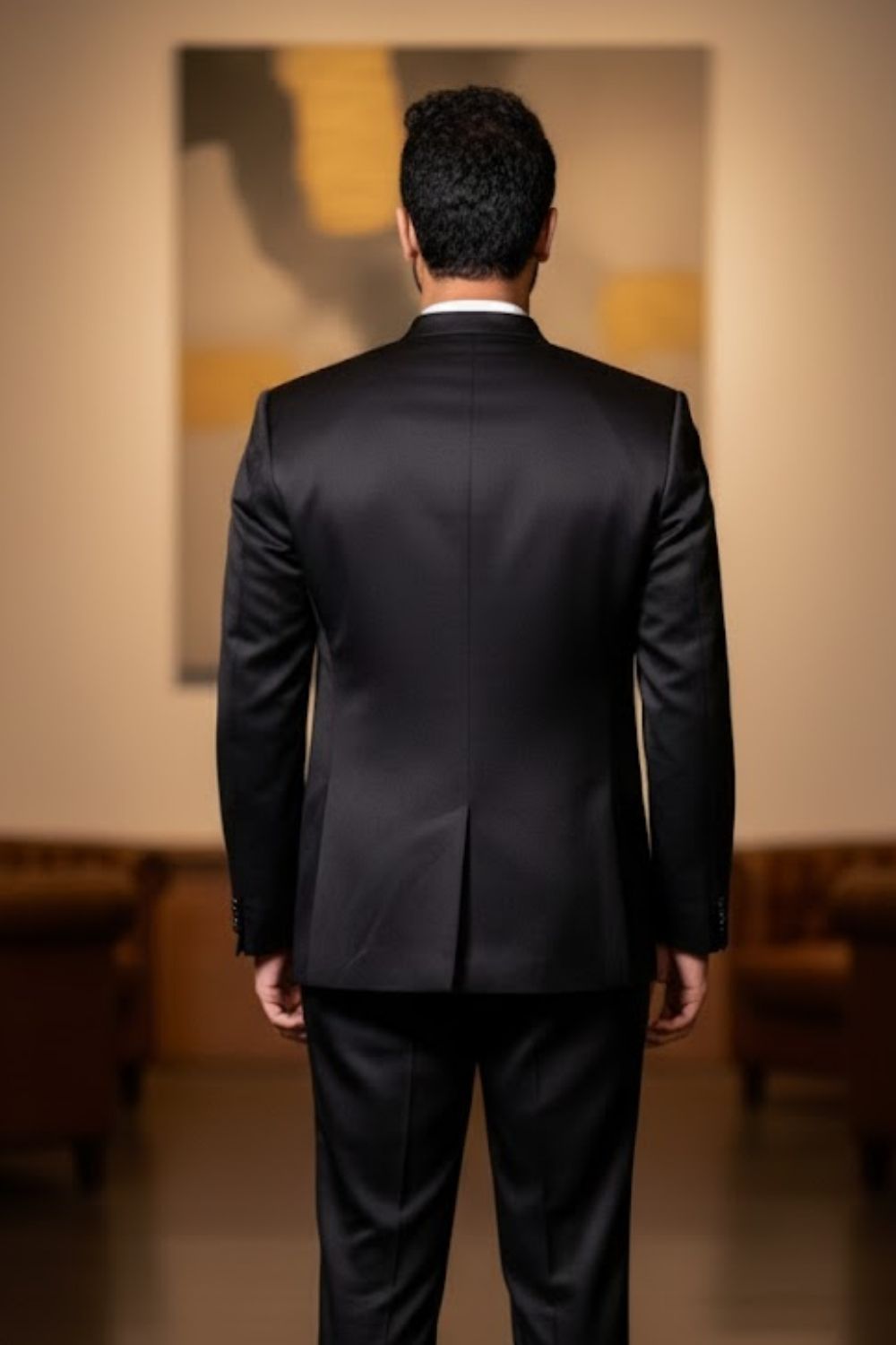 Rent this dapper black suit, featuring a subtle sheen from the satin fabric and clean modern tailoring, contemporary look perfect for evening events.