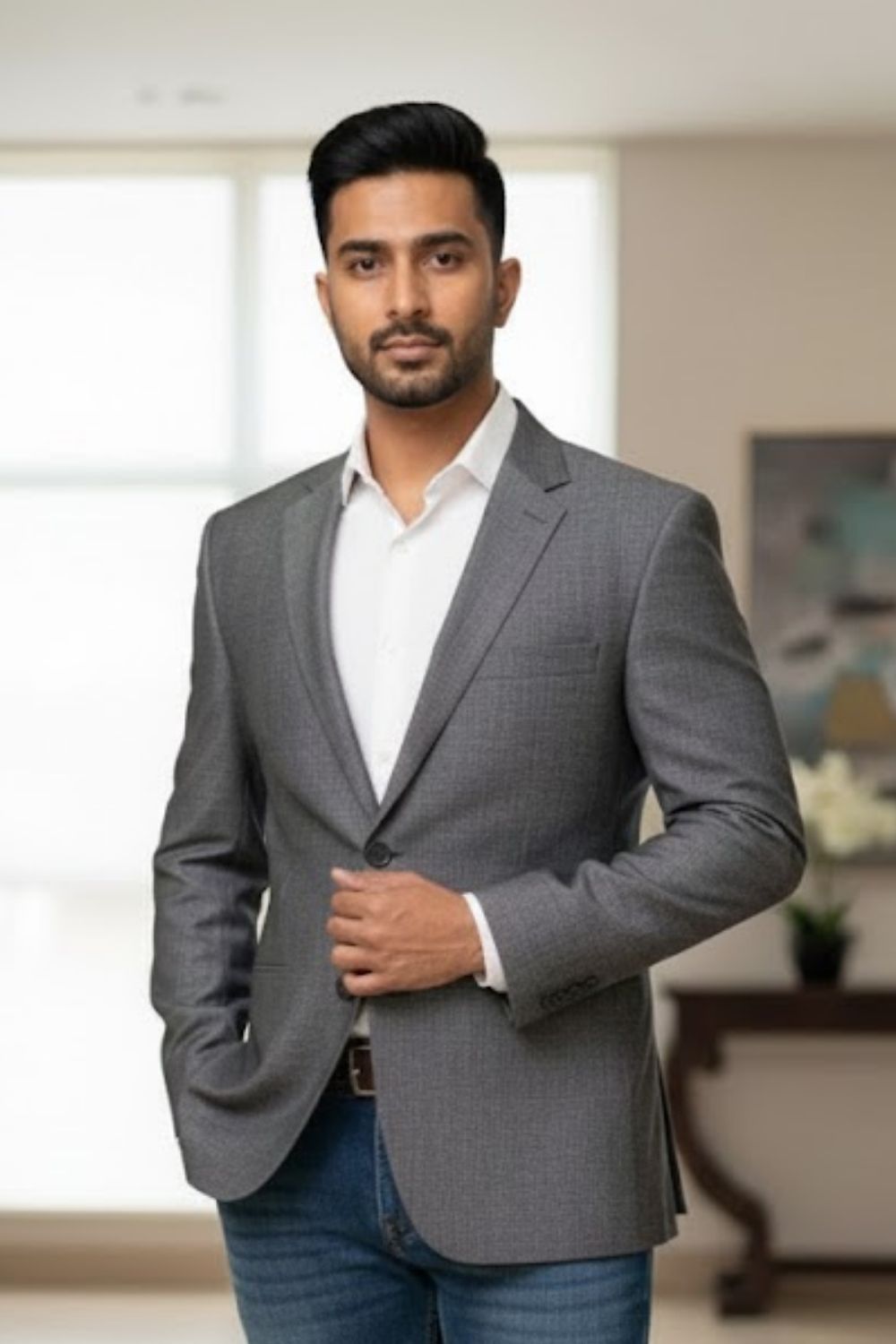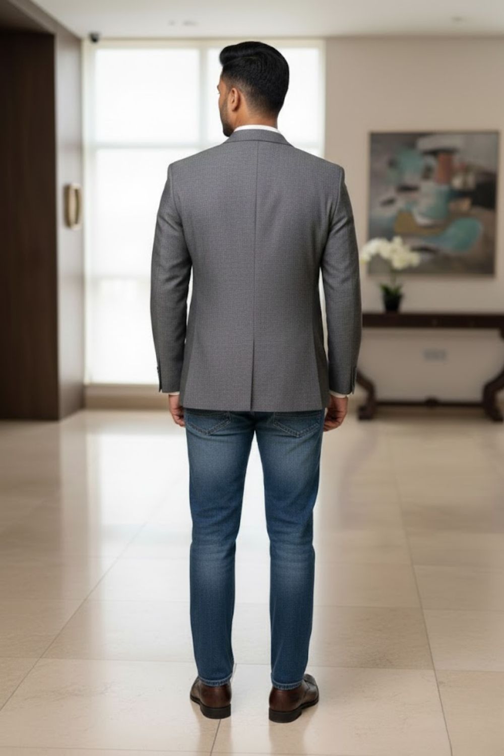 Rent this classic two-button blazer in light grey, with a fine Micro-Pattern woven into the textile for added texture and style.
