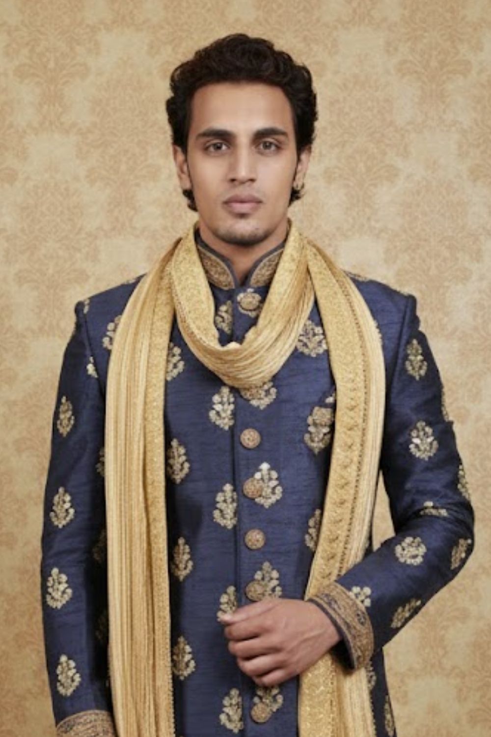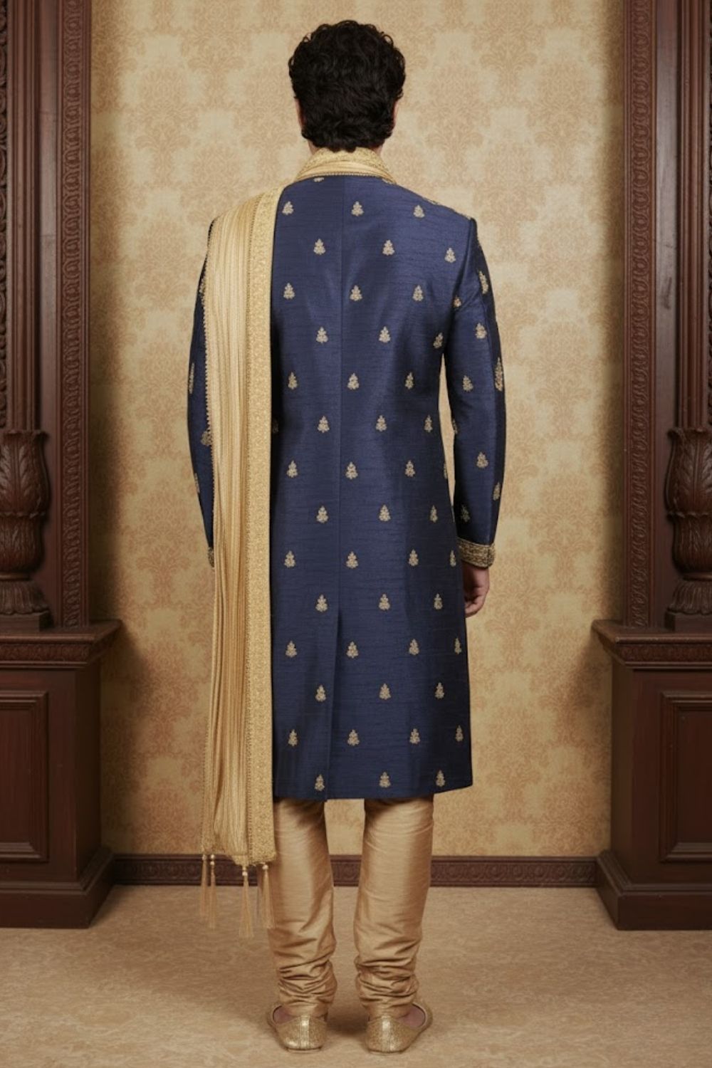 Rent this regal navy blue Sherwani in raw silk fabric, featuring rich all-over gold zari and thread embroidery in traditional floral motifs.