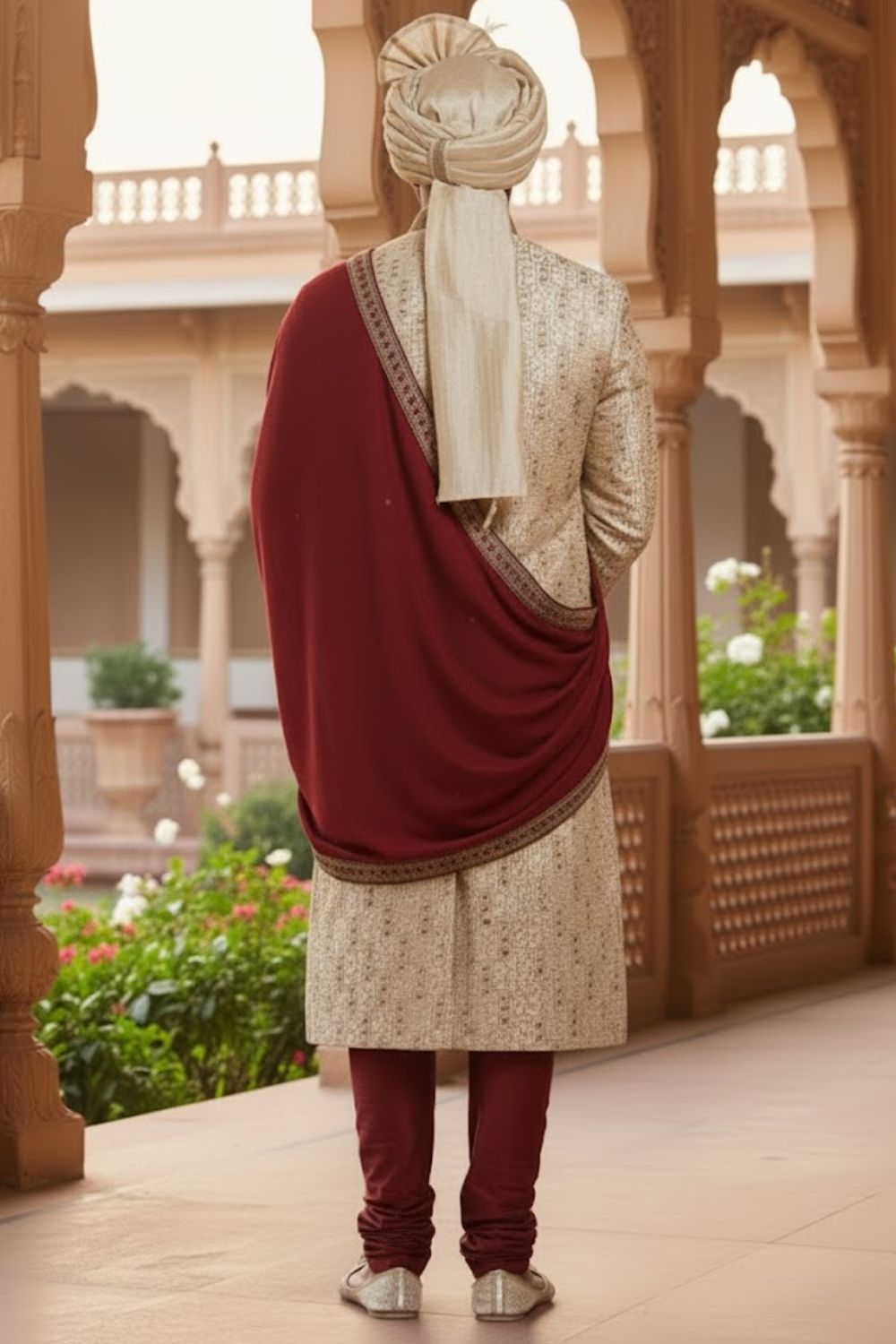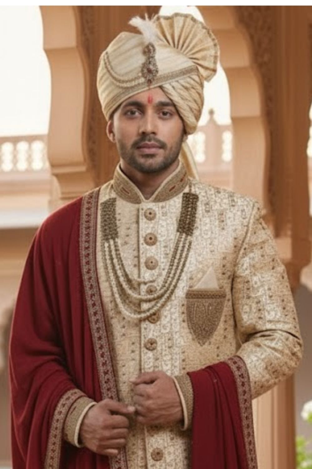 Rent this regal gold Sherwani with maroon churidar, showcasing traditional heavy embroidery for a royal appearance.